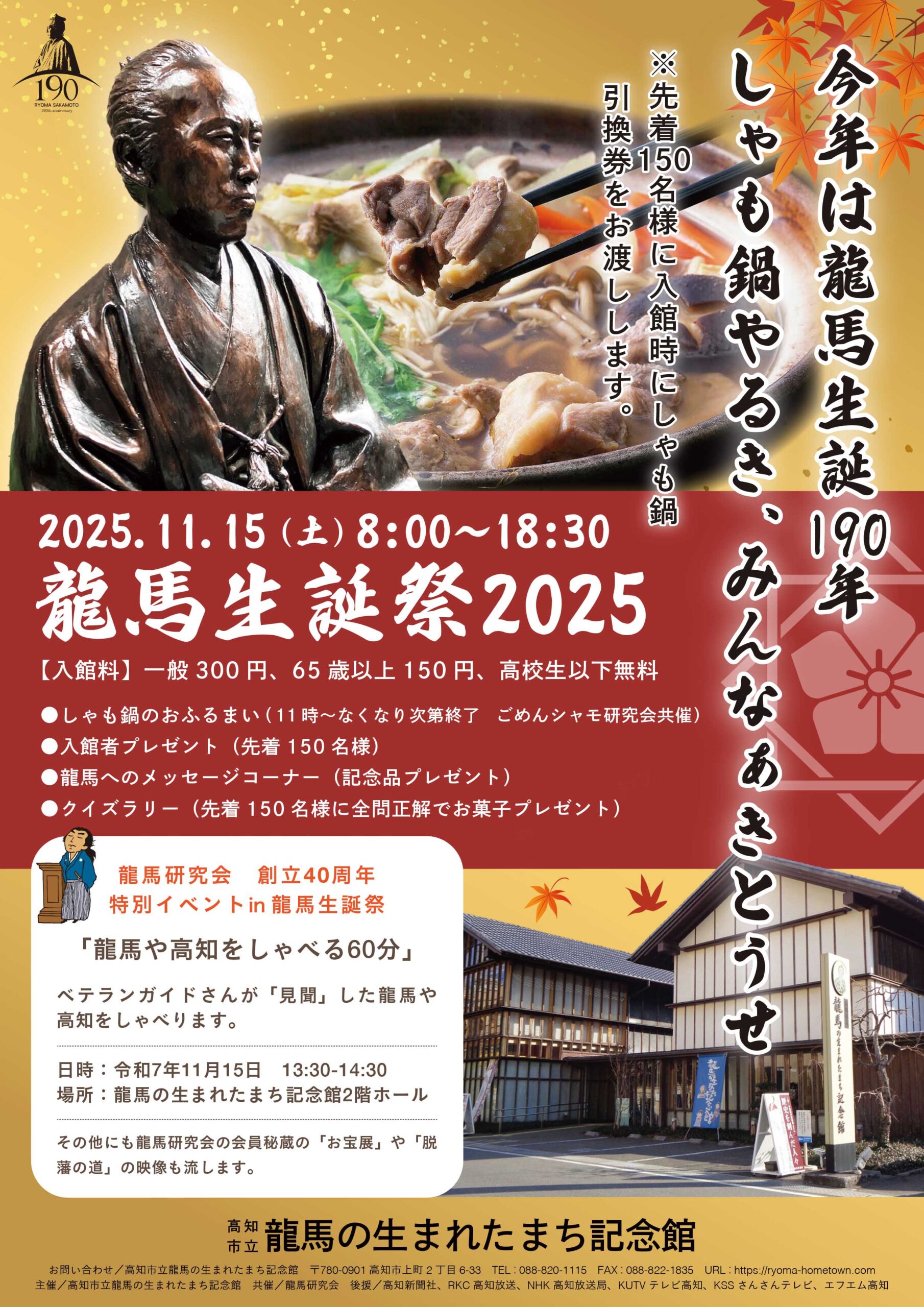 【内 容】しゃも鍋のおふるまいや入館者プレゼント、クイズラリー(各先着150名)、龍馬へのメッセージコーナー、龍馬研究会による講演会などを開催します。
